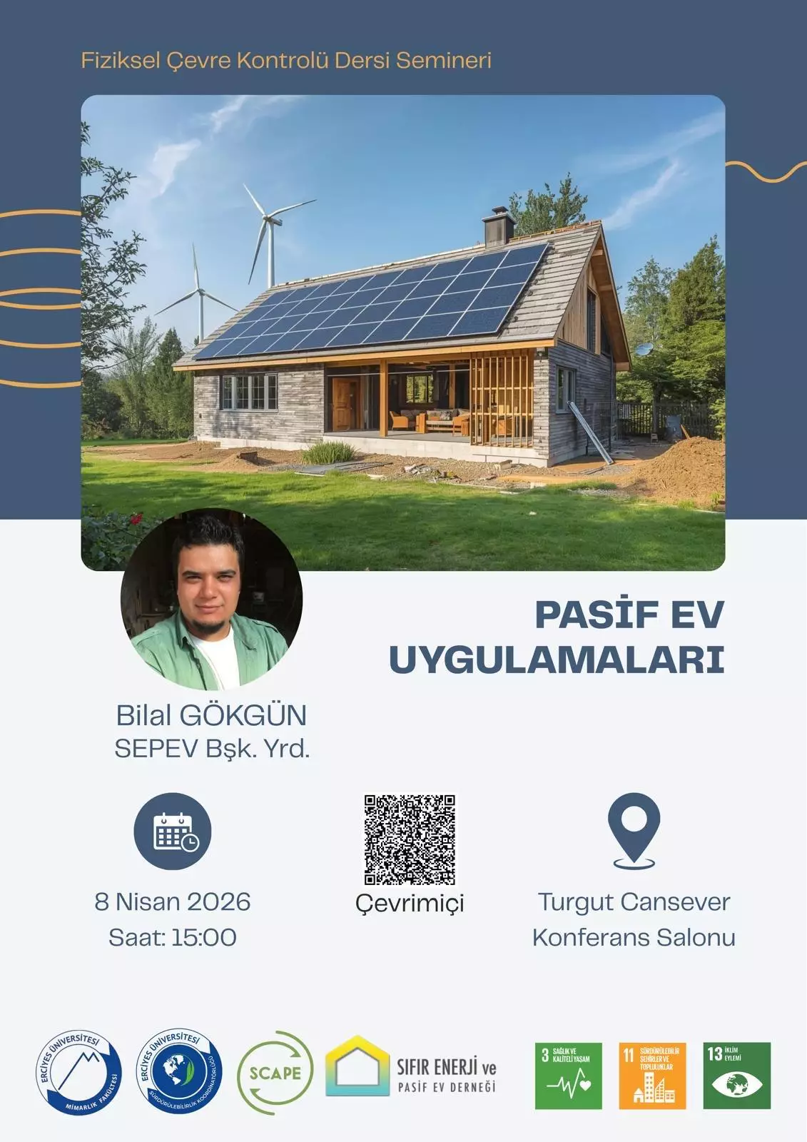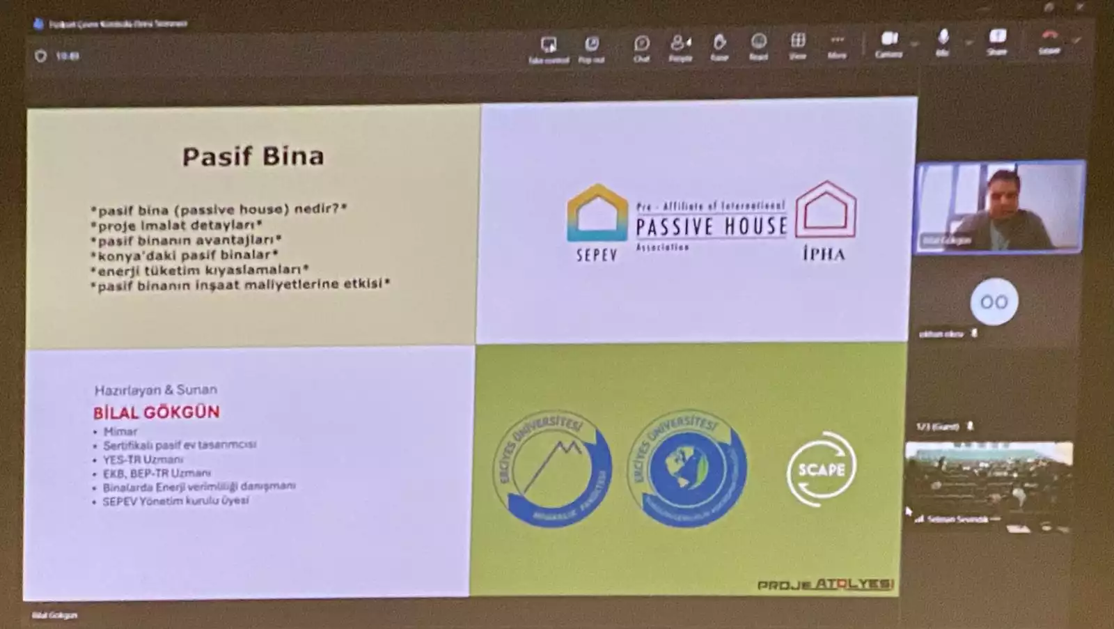 Fiziksel Çevre Kontrolü seminer serimizin bu dönemki ilk etkinliğinde, sürdürülebilir mimarinin Türkiye’deki en yetkin isimlerinden biri olan, Pasif Ev Tasarımcısı, SEPEV (Sıfır Enerji ve Pasif Ev Derneği) Başkan Yardımcısı ve Proje Atölyesi kurucusu Sayın Bilal Gökgün’ü ağırladık.
